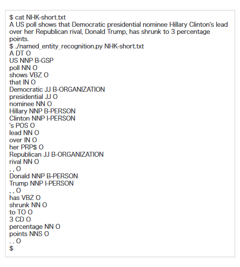 出力は各行単語、品詞、NEタグが表示されています。NEタグの先頭がB-の場合は固有表現の先頭、I-の場合は継続語を意味します。PERSONは人名、ORGANIZASIONは組織名、GSPは"Geo-Socio-Political group"の略です。"Hillary Clinton"や"Donald Trump"が人名として認識されていることが分かります。