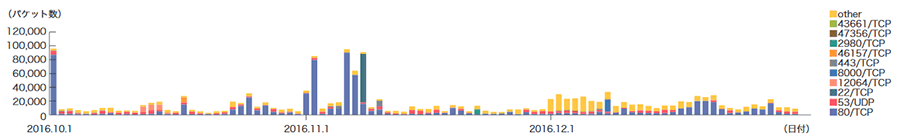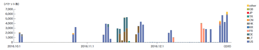 2016年10月から12月の間に観測したbackscatterについて、発信元IPアドレスの国別分類を図-3に、ポート別のパケット数推移を図-4にそれぞれ示します。
