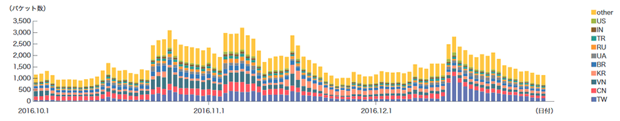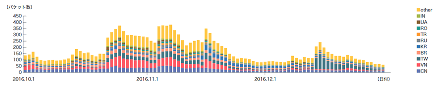2016年10月から12月の期間中に、ハニーポットに到着した通信の発信元IPアドレスの国別分類を図-5に示します。また総量(到着パケット数)に関して、本レポートの期間中に最も接続回数の多かった23/TCP、3番目に接続回数の多かった1900/UDP、4番目に接続回数の多かった2323/TCPはその他の通信よりも突出して多かったため、それぞれ図-6から図-8に別途記載し、残りの推移を図-9に示します。期間中、MITFでは、数多くのハニーポットを用いて観測を行っていますが、ここでは1台あたりの平均を取り、到着したパケットの種類(上位10種類)ごとに推移を示しています。また、この観測では、MSRPCへの攻撃のような特定のポートに複数回の接続を伴う攻撃は、複数のTCP接続を1回の攻撃と数えるように補正しています。