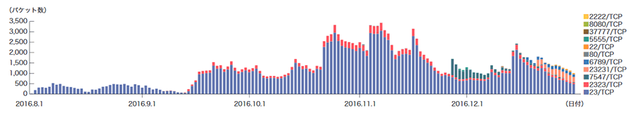 前回のレポートに引き続き、Telnetで使われる23/TCP宛ての通信が本レポート期間中でも引き続き高い値を示しており、更に10月後半から11月中旬までと12月中旬以降はより増加しています。これは前回レポートしたとおり、Miraiボット(※49)及びその亜種、Bashlite、KaitenやhajimeなどといったIoT機器のLinuxをターゲットにしたボットの感染が拡がっているためです。この通信は台湾、中国、ベトナム、韓国、ブラジルなどに割り当てられた多数のIPアドレスからの通信でした。また2323/TCP、7547/TCP、23231/TCPなどについてもMiraiボットやその亜種の影響であり、本レポートの期間中、大幅に増加しています。