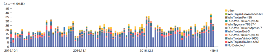 本レポート期間中、Confickerを含む1日あたりの平均値は、総取得検体数が3,961、ユニーク検体数は303でした。総取得検体数で75.8%、ユニーク検体数で93.1%を占めています。総取得権対数の割合が前回のレポート期間中より4分の1程度減少していますが、これはMiraiボットの亜種が取得できるようになったことによるものです。今回の対象期間でも支配的な状況が変わらないことから、Confickerを含む図は省略しています。本レポート期間中の総取得検体数は前回の対象期間と比較し、約5%減少し、ユニーク検体数は前号から約19%減少しており、本レポート期間中は全体的に緩やかに減少しています。Conficker Working Groupの観測記録(※58)によると、2017年1月現在で、ユニークIPアドレスの総数は45万台とされています。2011年11月の約320万台と比較すると、約14%に減少したことになりますが、依然として大規模に感染し続けていることが分かります。