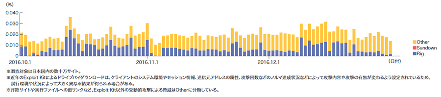 2016年10月から12月までの期間は、検知したドライブバイダウンロード攻撃のほぼすべてがRig Exploit Kitでした(図-17)。2016年9月末にNeutrinoが観測されなくなって以降、継続している傾向です(※61)。Rigのペイロードとして、Cerber、Ursnifなどを確認しています。また、10月の上旬にSundownを観測しました。確認したケースではInternet Explorer、Flash、Silverlightの脆弱性を悪用する機能を備えていました。
