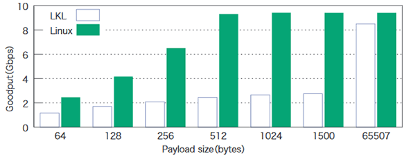 計測環境はIntel Core i7-6700というCPU(8コア、3.40GHz)を搭載した2台のPCに、Intel X540-T2という10GbpsのEthernetカード経由で接続された環境で行われました。比較対象にはLKLを利用していない、通常のLinuxカーネル(バージョン4.9.0)上で動作するnetperfプログラムを用いました。