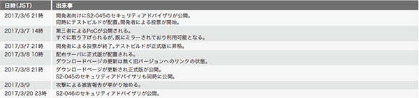 表-2 Struts2の脆弱性CVE-2017-5638(S2-045, S2-046)に関連するタイムライン