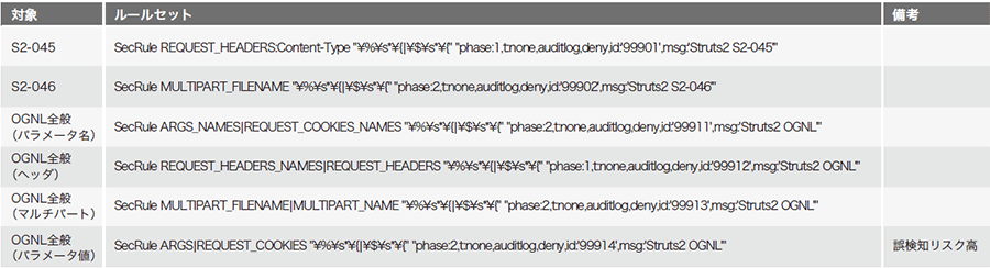 表-3 Struts2の脆弱性(CVE-2017-5638)のModSecurity用ルール