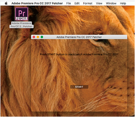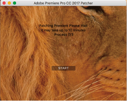 monitor.appを起動し、モニタリングを開始した状態で、Patcher アプリケーションのアイコンをダブルクリックして起動します。本稿で扱う検体は、アプリケーション名が「Adobe Premiere Pro CC 2017 Patcher」と偽装されています(図-16)。起動すると、背景が透過に設定されたアプリケーションウィンドウが展開し「START」ボタンをクリックするよう促すメッセージが表示されるので、クリックして先に進みます。