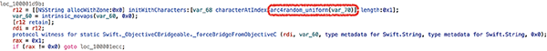 暗号化ZIPに用いるパスフレーズは、起動されるたびにarc4random_uniform ()によって異なる値が生成されています(※74) (図-25)。また、生成したパスフレーズを外部に送信し たり、ファイルに埋め込んだりして共有する機能の存在は確認されませんでした。これは、Patcherによって暗号化されたファイルは、本稿の動的解析のようにモニタリングログを記録している場合や、プロセス終了前にメモリからパスフレーズを読みだした場合などを除いて、復号する手段がないことを意味します。