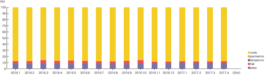 次に、2016年1月からの認証結果割合の推移を図-3に示します。残念ながら"none"の割合が87%前後で推移しており、ほとんど変化のない結果となりました。既にSPFやDKIMを導入していれば、DMARCレコードを記述するだけで送信側のDMARCは導入できたことになりますので、こうした認証率の低さは、DMARCが国内であまり認知されていないことを示しているものと考えています。