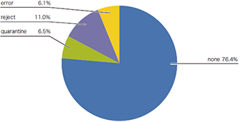 なお、"error"については、DMARC認証したメール受信時と、調査のためDMARCレコードを参照したときとの時間差があるため、その後ドメインが参照できなくなったなどのDNSエラーを示しています。6.1%と比較的高い割合ですが、とりあえず受け取ってもらうためにドメイン名あるいはそのDMARCレコードを立ち上げた、という場合が少なからずあるのかもしれません。
