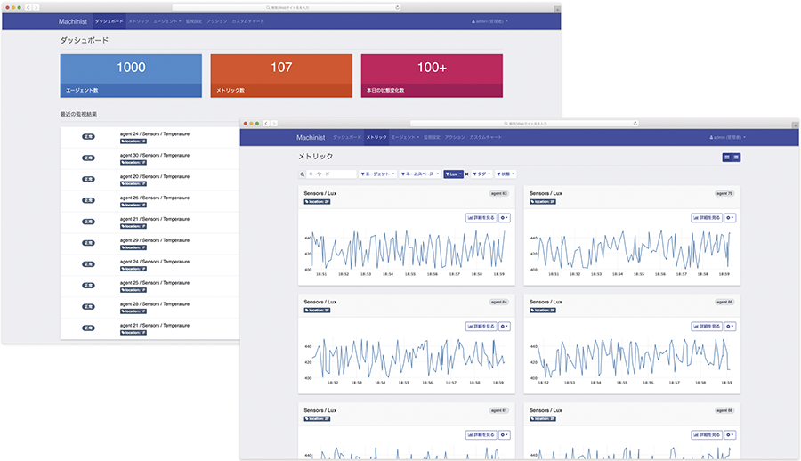 もう1つは"Machinist" (マシニスト)です。SMF Heartbeatプロトコルにはデバイスから既定の監視情報を収集するための仕組みがありました。Machinistはこの情報の収集機能を汎用化し、欲しい情報を好きなタイミングで収集できるように改良したものです。収集したデータは可視化され(図-3)、またデータの値の変化に応じて自動的にユーザへの通知や外部APIの実行といった特定のアクションを実行する機能を備えています。