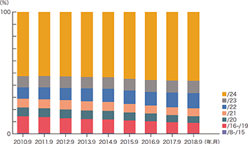 図-1「 IPv4 フルルート」に占める各プレフィクス長経路数の比率の推移