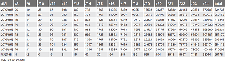 表-1「 IPv4 フルルート」に含まれるプレフィクス長ごとの経路数の推移