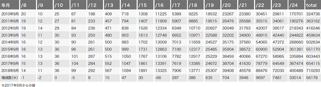 経路総数は過去8年間で最大の増加となり70万経路を超えました。またプレフィクス長ごとで見ると/22及び/23経路の増加率が10%を超えており、これらに/24経路を足した計3プレフィクスで経路増加数の89%、経路総数の79%を占めるまでになりました。移転を目的としたアドレスブロックの分割が更に進むに従ってこれらのプレフィクスの占める割合がどこまで伸びるのか、今後も注視したいと思います。