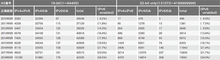 最後に追加で「IPv4/IPv6フルルート」広報元AS(Origin AS)の数も見ておきましょう(表-3)。IANAの16-bit AS番号poolが2016年7月に枯渇していることもあり、16-bit AS番号のOrigin AS数は同年から減少に転じています。一方の32-bit only AS番号(2007年1月割り当て開始)のOrigin AS数は順調に増加を続けていますがその大多数はIPv4のみで運用されているようです。これは、IPv4アドレス在庫が既に枯渇した状況下でAS番号を取得しBGP運用を開始したであろう新規組織であっても多くはIPv6の利用を考慮しない、という問題を示していると考えられ、IPv6の普及はまだまだ先が長いという現状が見て取れます。とはいえIPv4アドレスの取得がこの先より難しくなっていくであろうことは間違いありませんのでこの状況が今後も継続するのか否か、こちらも注視していきたいと思います。