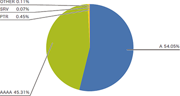 これはANYタイプの問い合わせが反射攻撃などに悪用され、IETFで対策の議論も続いているなどの現状があり、段々と利用されなくなってきているためだと考えています。問い合わせのIPプロトコルごとに傾向を見ると、IPv6による問い合わせが問い合わせ元IP数、実際の問い合わせ数共にIPv4よりも多くなっています。AとAAAAの問い合わせ傾向は通信に利用されるIPプロトコルで違いが見られ、IPv6での問い合わせではより多くのAAAAレコード問い合わせが見られます。IPv4での問い合わせでは、全体の87%程度がAレコード問い合わせ、11%程度がAAAAレコード問い合わせです(図-2)。一方IPv6での問い合わせでは、全体の54%程度がAレコード問い合わせ、45%程度がAAAAレコード問い合わせとAAAAレコード問い合わせの比率が高まっています(図-3)。