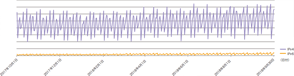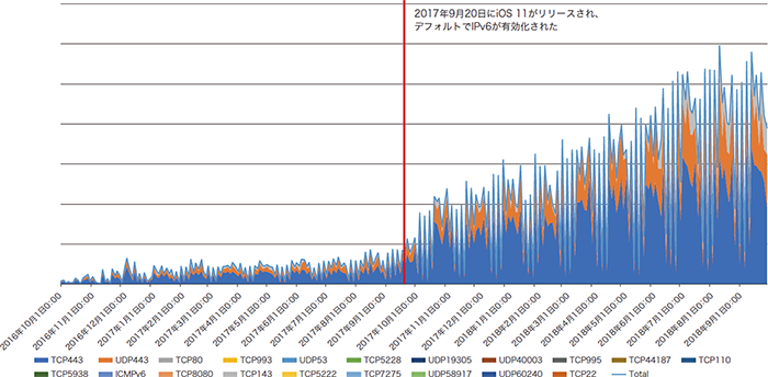 これは、米Apple社のiPhoneやiPadのOSであるiOSバージョン11のリリースと重なります。iOSバージョン11では、MVNOのAPNプロファイル(モバイル網に接続するための情報ファイル)でも、デフォルトでIPv6接続が有効化されたことから、多くのユーザの端末でIPv6が利用され始めたためと考えられます。