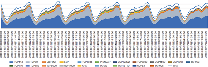 IPv6トラフィックのプロトコル番号(Next-Header)と送信元ポート番号で解析したグラフを図-8に、IPv4トラフィックのプロトコル番号と送信元ポート番号のグラフを図-9に示します(2018年10月1日からの1週間)。
