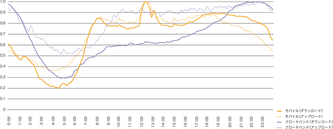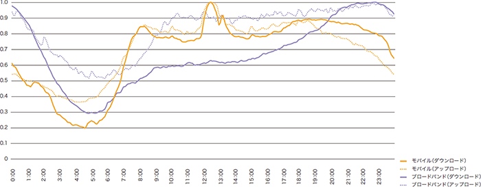 また、モバイル、ブロードバンド共にダウンロードの方が1日を通じた変動が大きくなっています。ブロードバンドは朝方から夜のピークにかけて徐々にトラフィックが増え続ける傾向にあり、一方のモバイルはブロードバンドと比べ、朝になると急激に増え、その後も日が変わる直前まで利用が多いことが分かります。