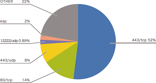 モバイルとブロードバンド、いずれもHTTP関連プロトコル(443/tcp及び80/tcp)が全体の約3/4を占めています。また、443/udpを使うQUICという比較的新しいプロトコルも上位に入っています。なお、QUICの通信先は特定のインターネットサービス事業者に著しく偏りが見られます。興味深いのは、ブロードバンドよりもモバイルの方が443/tcp、つまりはHTTPSの割合が高い点です。モバイル利用者の多くはスマートフォンを使用していると推測されますが、単純にWebページを汎用的なブラウザから閲覧するよりも、ある用途に特化した様々な専用アプリケーションを使う機会が多く、そこで利用されるプロトコルは多くがHTTPSであるのかもしれません。