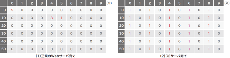 図-2 正規のWebサーバとの通信(左)とC&Cサーバへの定期的な通信(右)イメージ