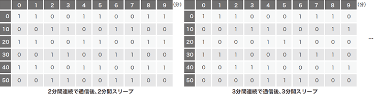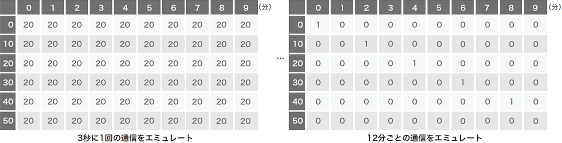 学習データセットは、良性サンプルにはWebプロキシログを変換した150万枚を超える「画像」を使用し、悪性サンプルには実際のマルウェアの通信パターンは一切使わず、定期的な通信パターンをエミュレートしています。これにより、検体を入手できなくても想定可能な悪性パターンを生成し、学習するだけでマルウェアを検出できます。これがBlack Hatで発表した際の副題に含まれている「Zero Knowledge」にかかっています。エミュレートしたインターバルは3秒から12分まで幅広く取り(図-3)、それに加えて特殊ケースとして数分間連続で通信した後、数分間スリープするようなパターンも生成しています(図-4)。更に、想定するパターンから少しだけ異なるパターンが出現した場合やCNNに対する攻撃(※4)の耐性を上げるために、生成したパターンを1ドットずつずらすローテーション、もしくは既存の値をランダムで一部クリアするなどして、合計で約100万枚のパターンを生成しました。