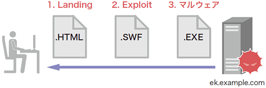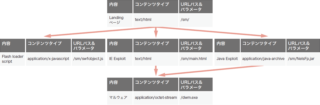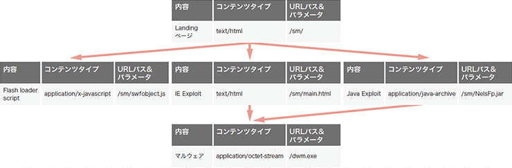 Webを閲覧しているPCがExploit kitに誘導されたとき、Exploit kitのサーバは図-10の順にコンテンツを送信します。