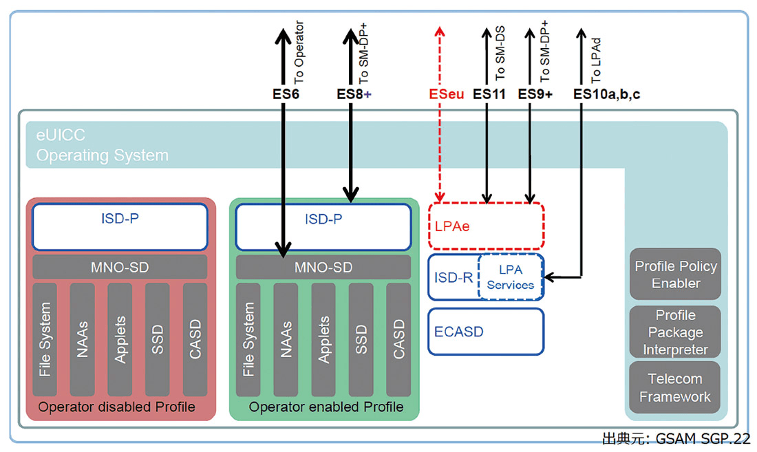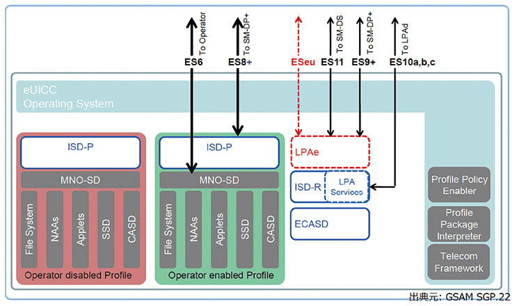 eSIM内部は、図-1のような構造となっています。この内、eSIMを特徴付ける要素が、ISD-R、ISD-P、ECASDの3つです。