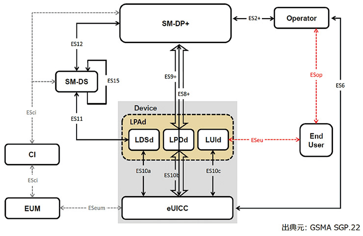 コンシューマモデルは、M2Mモデルの次に策定された仕様です。スマートフォンなど、エンドユーザが直接操作するデバイスが対象で、eSIMの操作はすべてデバイス上で行えるようになっています。コンシューマモデルの構成要素を図-3に示しますが、主要な構成要素は以下の通りです。