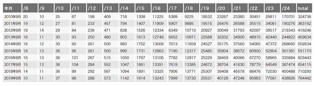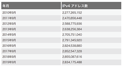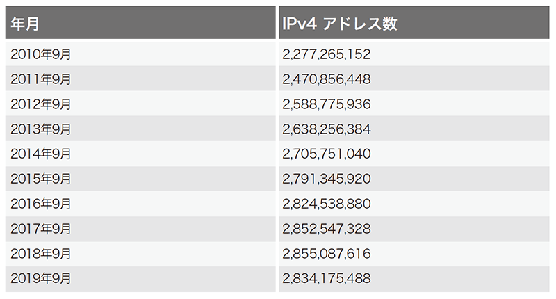 表-2 「IPv4 フルルート」に含まれるunique IPv4アドレス総数の推移