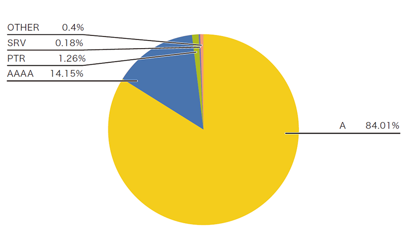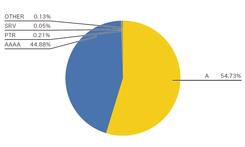 問い合わせレコードタイプに注目すると、ホスト名に対応するIPv4アドレスを問い合わせるAレコードとIPv6アドレスを問い合わせるAAAAレコードがほとんどを占めています。AとAAAAの問い合わせ傾向は通信に利用されるIPプロトコルで違いが見られ、IPv6での問い合わせではより多くのAAAAレコード問い合わせが見られます。IPv4での問い合わせでは、全体の84%程度がAレコード問い合わせ、14%程度がAAAAレコード問い合わせです(図-1)。一方IPv6での問い合わせでは、全体の54%程度がAレコード問い合わせ、44%程度がAAAAレコード問い合わせと、AAAAレコード問い合わせの比率が高まっています(図-2)。昨年と比べると、IPv6はほぼ同様の傾向を示している一方、IPv4では3ポイント程度Aレコードの問い合わせが減り、AAAAレコードの問い合わせが3ポイント程度増加しています。