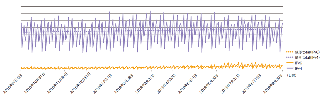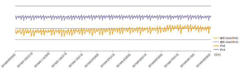 前回同様、IIJのコアPOP(東京・大阪・名古屋)のバックボーンルータで計測した、IPv4トラフィックとIPv6トラフィックを図-3に示します。期間は2018年10月1日から2019年9月30日までの1年間です。