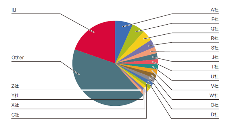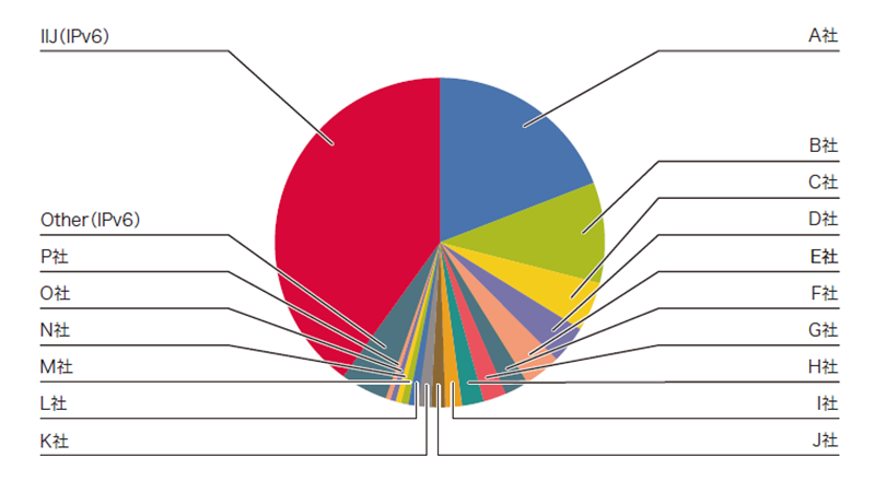 やはり最上位はA社ですが、2位以下とのトラフィック量の差が更に縮小すると共に、占有率も前回比で6割程度に下がりました。これは、多くの事業者でIPv6の活用が進んでいると共に、2019年7月からIIJの関連会社で動画配信プラットフォームの提供を行うJOCDNのプラットフォームを利用している動画配信サービスでIPv6が有効化されたことで、IIJのIPv6トラフィックが増加したためと思われます。