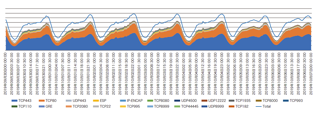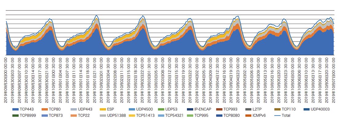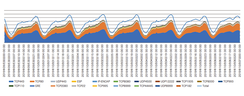 IPv6トラフィックのProtocol番号(Next-Header)と送信元ポート番号で解析したグラフを図-8に、IPv4トラフィックのProtocol番号と送信元ポート番号のグラフを図-9に示します(2019年9月30日からの1週間)。