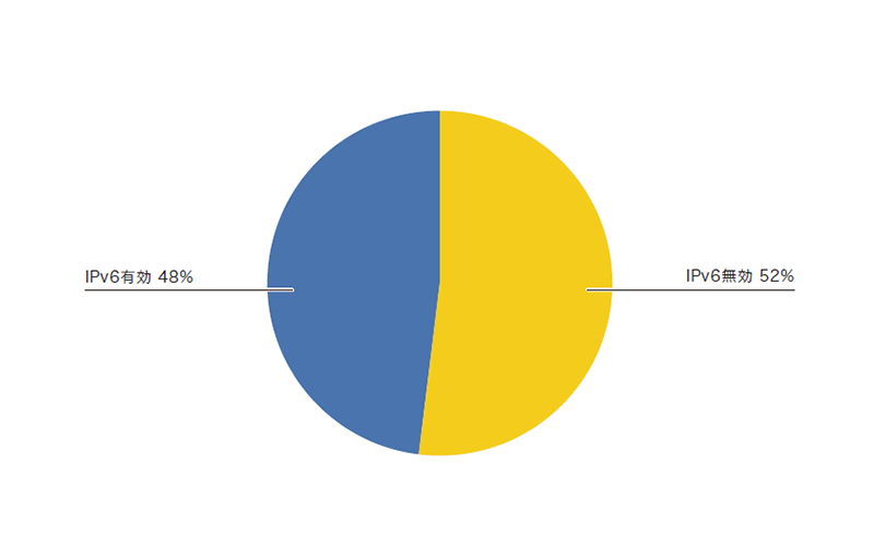 まず、IPv6が有効化されている接続の割合ですが、図-10のとおり、有効48%、無効52%とほぼ半々となっています。接続数はほぼ半々ですが、トラフィックについては、IPv4が約8割、IPv6は2割程度になっています。