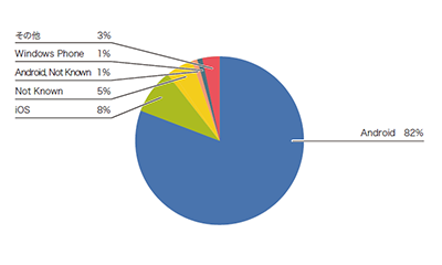 まず、IPv6が有効になっている端末のOSを調べてみます。図-11のとおり、8割以上がApple iOSで、Androidは14%でした。次に、IPv6が無効になっている端末のOSを見てみます。図-12のとおり、先程と逆転し、Androidが82%、iOSが8%でした。