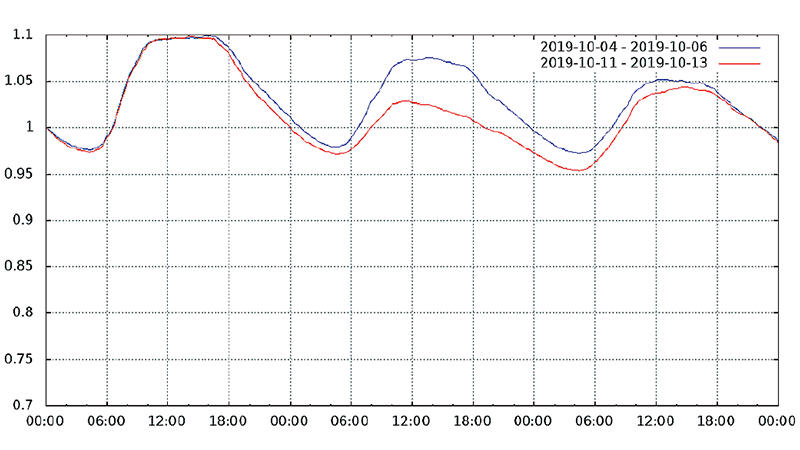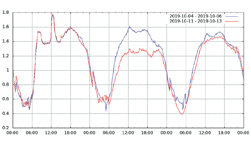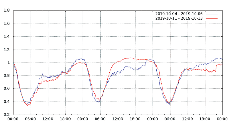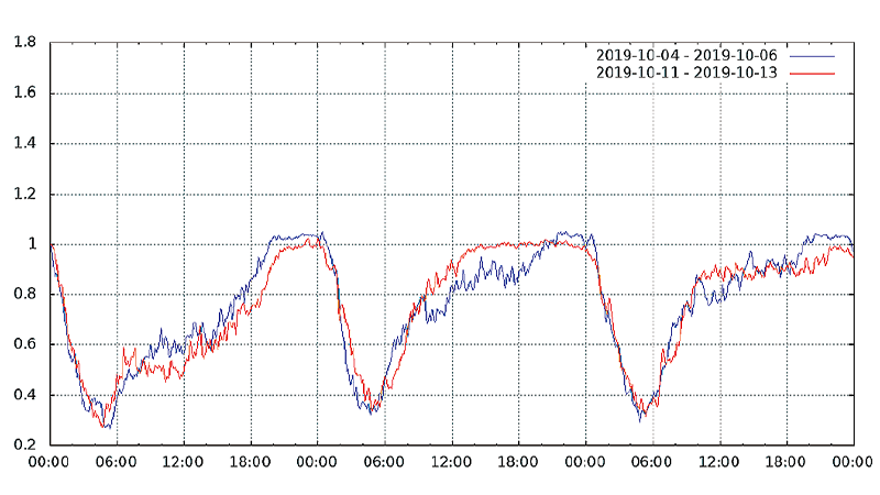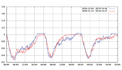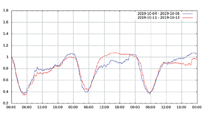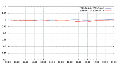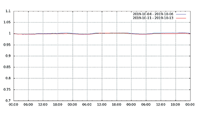 図-13から図-24は、台風19号が本州を通過した2019年10月12日前後及び対比のため1週間前の2019年10月5日前後の接続数とトラフィック量(アップロードとダウンロードの合計)の推移を表したグラフです。いずれも、金曜日(2019年10月4日、2019年10月11日)00:00の値を1として正規化しています。