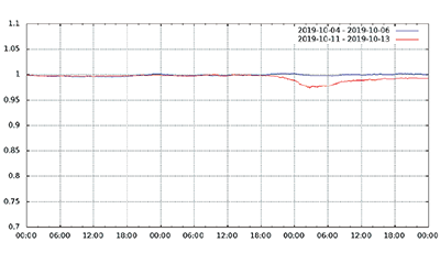 まずは接続数に着目してみます。現在、フレッツの利用者の多くはブロードバンドルータやホームゲートウェイを介した常時接続のため、通常は1日を通じて接続数の変化はほとんどありません。実際、台風19号の影響がほとんどなかったフレッツ大阪エリアでは、期間中の接続数の変化はごくわずかでした。