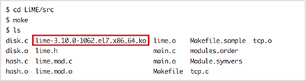 LiMEのコンパイルを行うには、最初に図-1のようにgitコマンドでLiMEのソースコードを取得するか、GitHubのLiMEのページからzipファイルをダウンロードして適当なディレクトリに展開します。ソースコードを展開したディレクトリ内の「src」ディレクトリにMakefileがあるので、このディレクトリでmake コマンドを実行すればLiMEモジュールが生成されます(図-2 の赤枠で囲ったファイル)。LiMEのコンパイルには、カーネルモジュールのコンパイルに必要なパッケージ(kernel-develやgccなど)が必要になるため、makeコマンド実行時にエラーが発生する場合は図-3のように関連するパッケージをインストールしてみてください。
