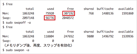 図-23 メモリ使用状況の確認とスワップ無効化および有効化
