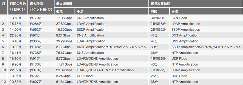 DDoS攻撃の発生件数は月単位で1日あたりの平均を算出していますが、2019年にはDDoS攻撃が顕著に活発な月はありませんでした。1秒あたりのパケット数が最も大きかったのは5月で、最も長い攻撃は1月に発生していました。また、最大パケット数が比較的大きかったのは5月、7月、12月でしたが、攻撃の最長時間は1時間未満に収まっていました。毎月の最大通信量及び最大攻撃時間で利用された攻撃種別の多くはLDAPやDNSを用いたUDP Amplificationが目立っています。