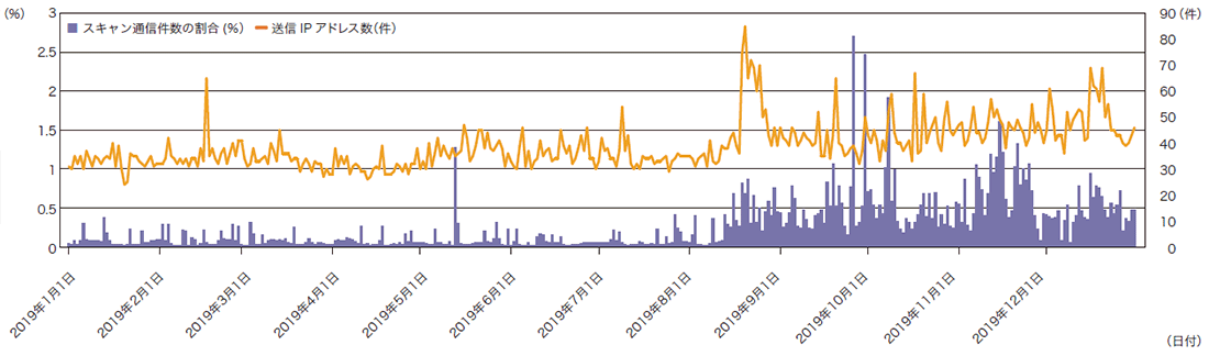 図-3 3283/UDPにおけるスキャン通信と送信元IPアドレス数の推移(2019年1月~12月)