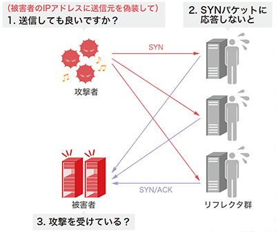 3つ目は、SYN/ACKリフレクション攻撃です。これは、TCPのthree-way handshakeの過程において、送信元アドレスを偽装したSYNパケットを多数のアドレスに同時に送信し、その応答であるSYN/ACKパケットを利用して送信元アドレスに対してDDoS攻撃を行う手法です。図-4にSYN/ACKリフレクション攻撃の全体像を示します。