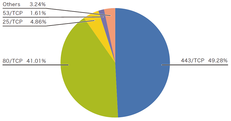 SYN/ACKリフレクション攻撃が日本国内の企業に向けたDDoS攻撃で利用された事例として、表-2の6月の最大通信量・最長攻撃時間を記録した攻撃が挙げられます。SYN/ACKリフレクション攻撃の大きな特徴は、リフレクタとして任意のTCPポートが利用されるため、WSDやARMSのように特定のポートに紐づくサービスを悪用するものではありません。そのため、Webサーバで一般的に利用される80/TCPや443/TCPなどが利用されます。例えば、インターネット上に公開しているWebサーバ上のコンテンツは、幅広く閲覧してもらうために何処からでもアクセスできることが重要になります。この場合、ファイアウォールは意図して誰でもアクセスできる設定になっているはずです。この前提の上で、SYN/ACKリフレクション攻撃のリフレクタとして利用された場合、リフレクタ側では容易にアクセス拒否することが難しいと考えられます。 図-5に、2019年にSOCで観測したSYN/ACKリフレクション攻撃のリフレクタとして利用されたTCPポートの割合を示します。