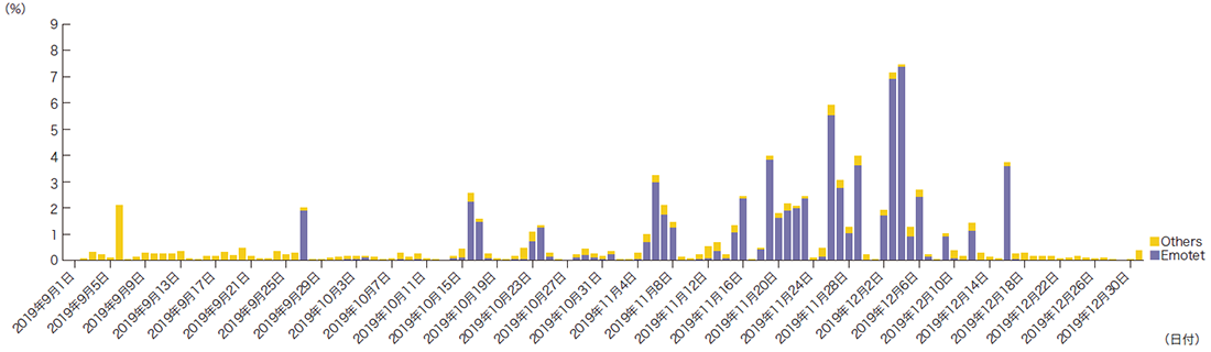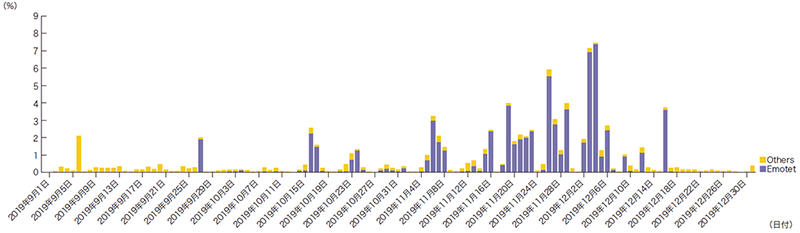 まず2019年9月から12月に検出した攻撃について、Emotetに関連する検出とその他の検出に分けた積み上げグラフを図-7に示します。図の横軸は日付を、縦軸は集計対象期間における合計検出件数を100%として正規化した割合を表します。