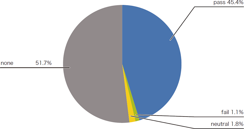 送信ドメイン認証技術の普及率を調査する観点として、実用上の効果を考えれば、メール受信時の認証結果の割合が重要であると考えることができます。IIJが提供するメールサービスでは、メール受信時にSPF、DKIM、DMARCの送信ドメイン認証機能を提供しています。受信メールのうち、それぞれで認証ができなかった場合の結果はnoneとなります。つまり、受信メールに対しての認証結果noneを除いた割合が受信メールに対する普及率の割合と言えます。
