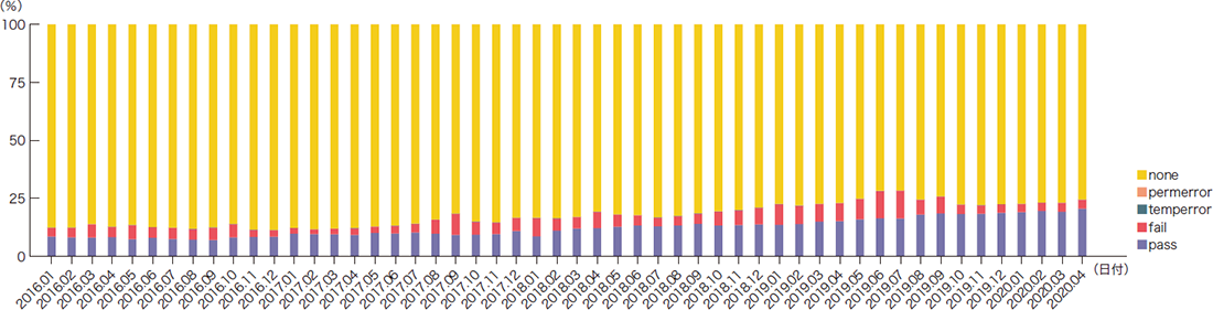 図-4に2016年1月からのDMARCの認証結果の割合の推移を示します。このグラフからも、2020年4月が時期的に極端に低かったということではなく、少しずつDMARCに対応した送信ドメインは増えてきているものの、その伸びが非常に緩やかであったことが分かります。