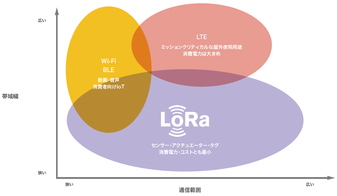 LoRaWAN®はLPWA(Low Power Wide Area)と呼ばれる低消費電力、低ビットレート、広域カバレッジを特徴とする無線ネットワークの一種です。LPWAには他にSigfoxやLTE-Mなどを代表とする多数の無線ネットワークがあります。SigfoxやLTE-Mは通信事業者が基地局を全国展開しており、通信エリア内であれば基地局を自前で設置しなくても利用可能です。