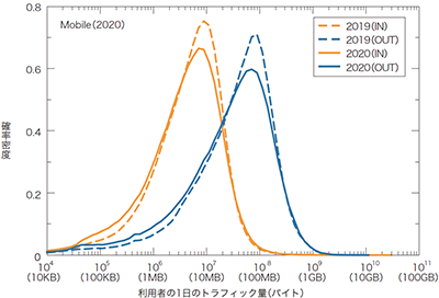 OUTの分布はINの分布より右にずれていて、ダウンロード量がアップロード量より、ひと桁以上大きくなっています。2019年と2020年で比較すると、INとOUT共に分布の山が右に移動しており、利用者全体のトラフィック量が増えていることが分かります。今回は前回に比べてこの増加量が大きくなっています。