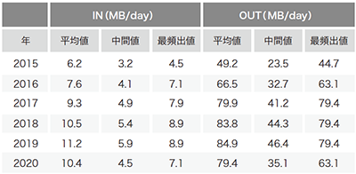 モバイルでは、ヘビーユーザが少ないため、平均と最頻出値が近い値になります。表-2に示すように、今回はすべての項目で減少しています。2020年の最頻出値は、INで7MB、OUT で63MBで、平均値は、INで10MB、OUTで79MBです。2019 年の最頻出値は、INで9MB、OUTで79MB、平均値は、INで11MB、OUTで85MBでした。