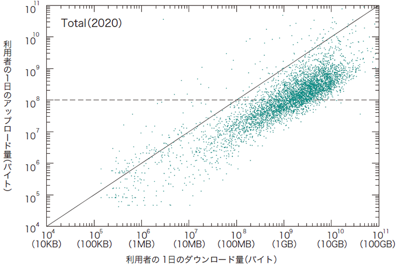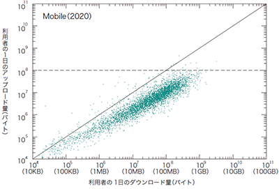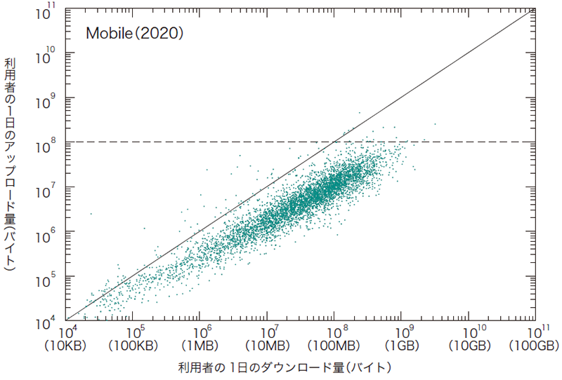 対角線の下側に対角線に沿って広がるクラスタは、ダウンロード量がひと桁多い一般的なユーザです。ブロードバンドでは、以前は右上の対角線上あたりを中心に薄く広がるヘビーユーザのクラスタがはっきり分かりましたが、今では識別ができなくなっています。また、各利用者の使用量やIN/OUT比率にも大きなばらつきがあり、多様な利用形態が存在することが窺えます。モバイルでも、OUTがひと桁多い傾向は同じですが、ブロードバンドに比べて利用量は少なく、IN/OUTのばらつきも小さくなっています。ブロードバンド、モバイル共に2019年との違いはほとんど分かりません。